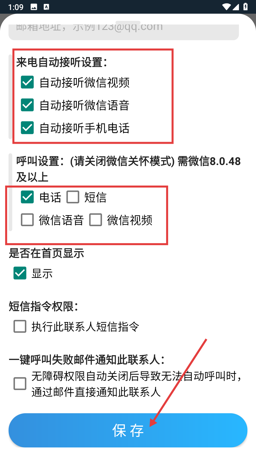 4、設(shè)置來(lái)電自動(dòng)接聽(tīng)和呼叫選項(xiàng)后,點(diǎn)擊紅色箭頭指向的【保存】按鈕,保存設(shè)置。