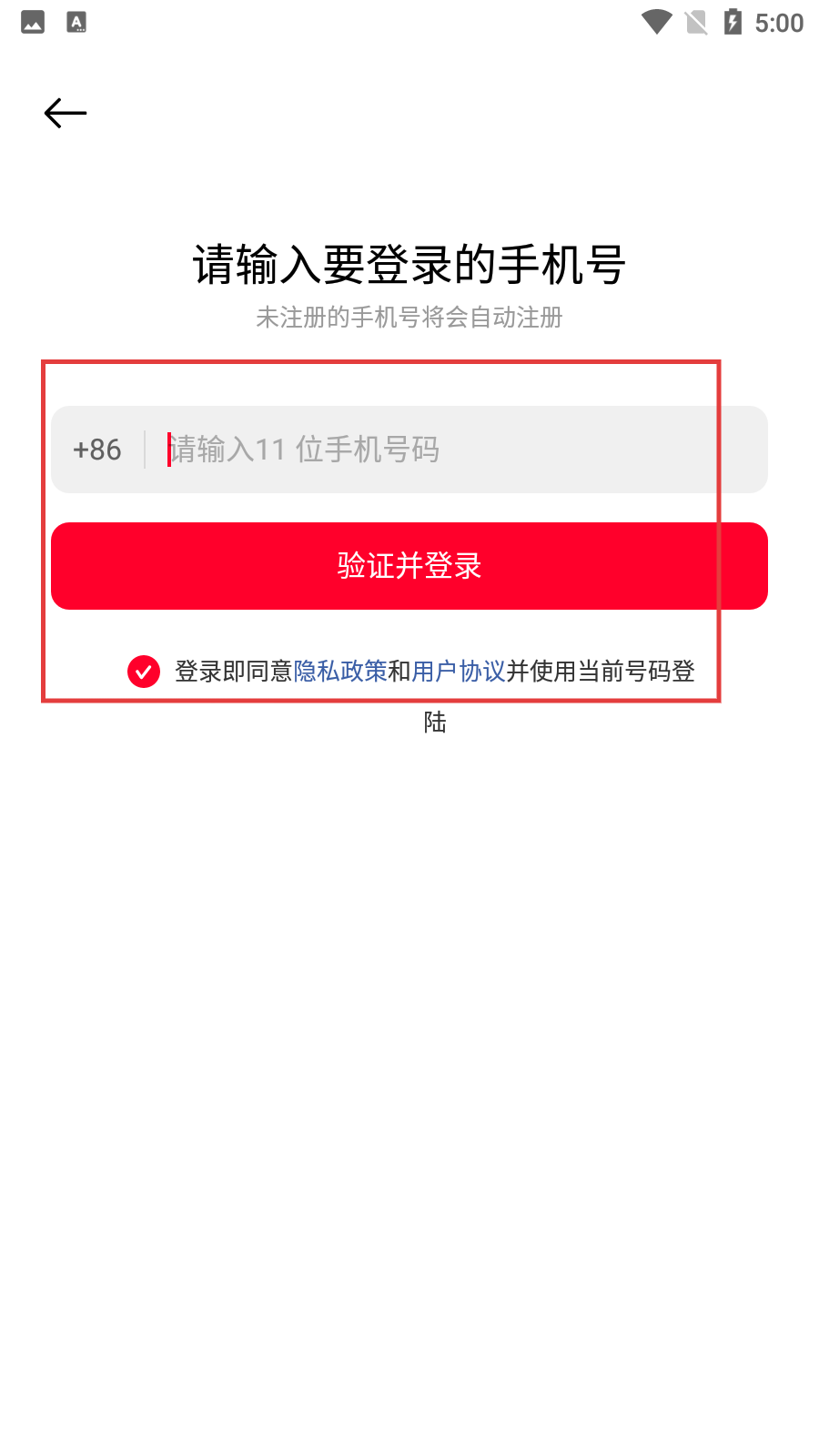 3、在手機號輸入界面,輸入11位手機號碼后,點擊【驗證并登錄】,進入驗證碼輸入頁面。
