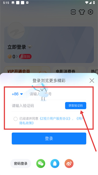 3、在登錄窗口中,輸入手機(jī)號,點(diǎn)擊【獲取驗(yàn)證碼】,并勾選同意用戶協(xié)議和隱私政策。