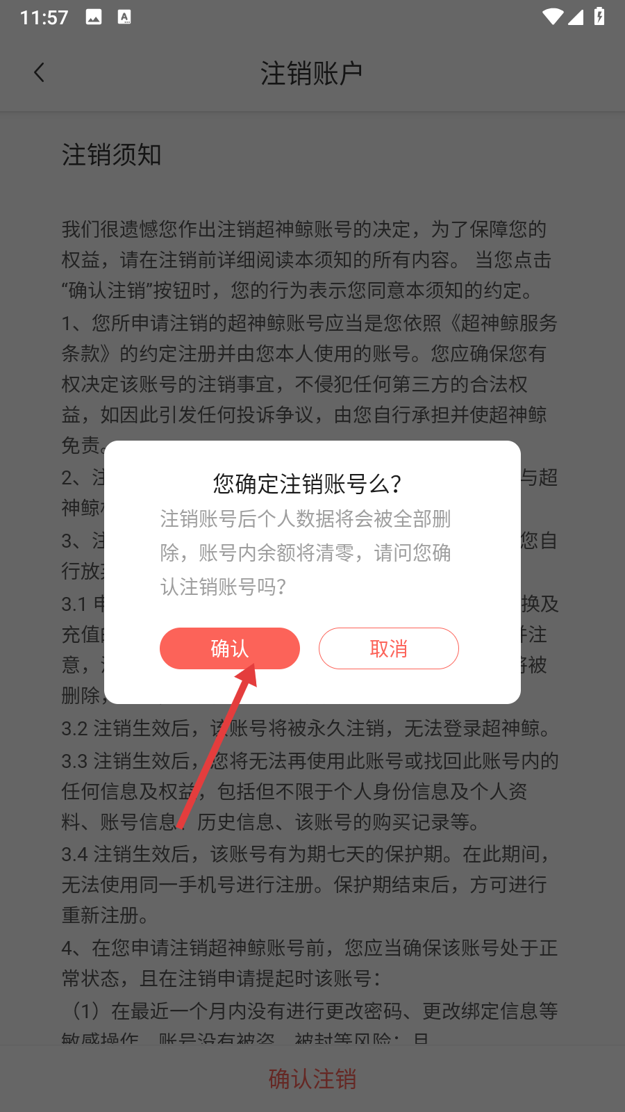 4、在彈出的確認框中點擊【確認】,完成賬號注銷操作。