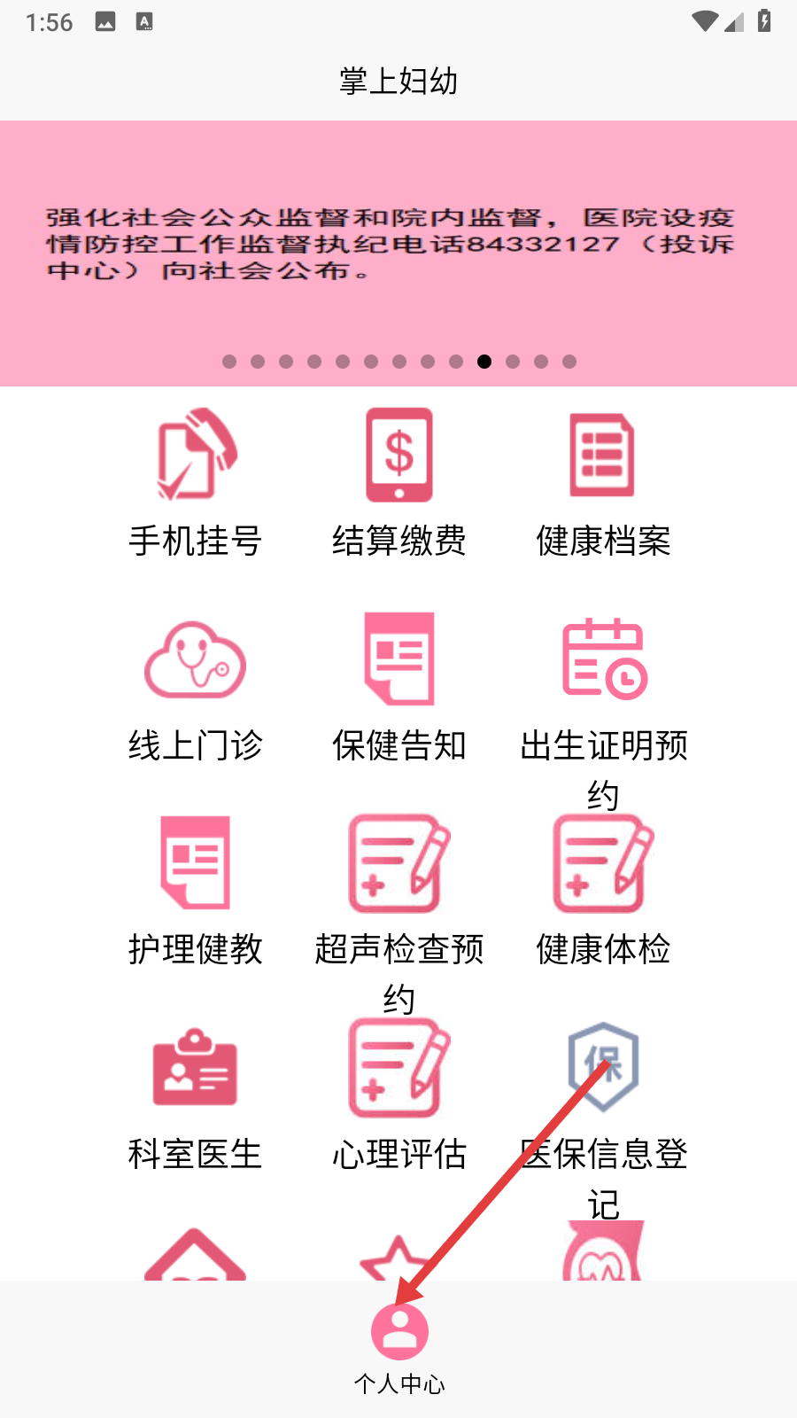 1、在“掌上婦幼”首頁點(diǎn)擊【個(gè)人中心】。