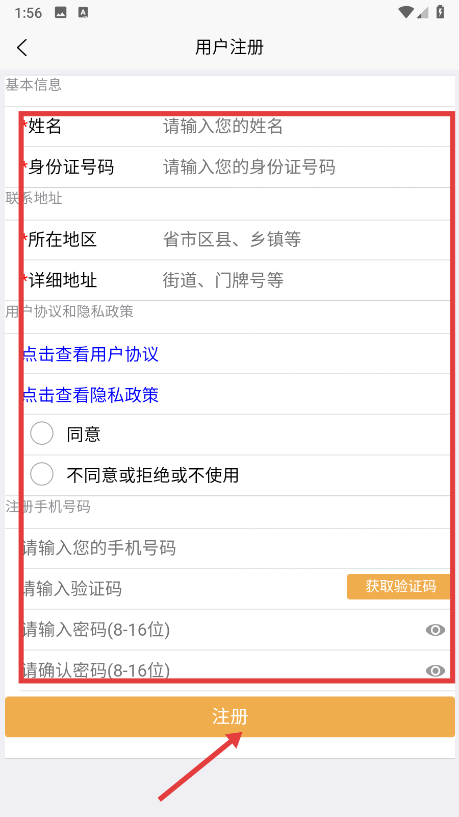4、在用戶注冊頁面,填寫姓名、身份證號碼、所在地區(qū)等信息后,點(diǎn)擊【注冊】,完成賬號注冊操作。