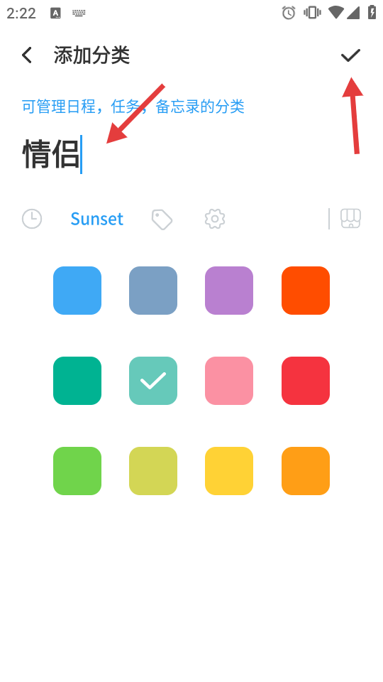 4、在添加分類(lèi)界面輸入分類(lèi)名稱(chēng)(如【情侶】),選擇樣式后點(diǎn)擊右上角對(duì)勾,完成分類(lèi)添加。