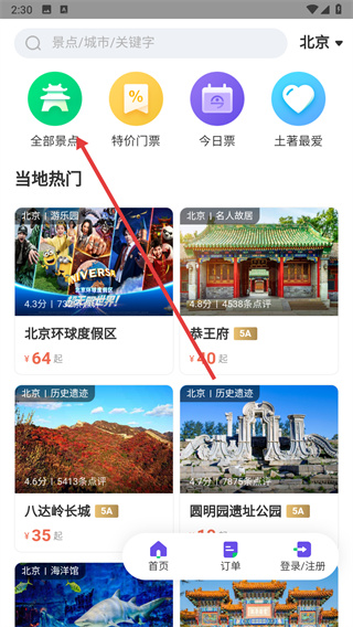 2、在景區(qū)票務(wù)頁面點(diǎn)擊【全部景點(diǎn)】,進(jìn)入北京景點(diǎn)列表頁面。