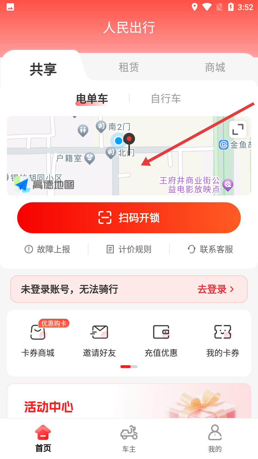 2、在電單車頁(yè)面點(diǎn)擊地圖區(qū)域,進(jìn)入詳細(xì)地圖頁(yè)面查看附近的電單車車輛。
