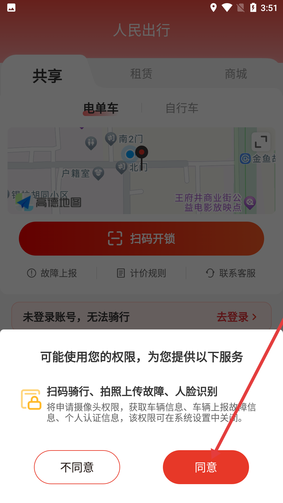 4、在權(quán)限提示頁(yè)面點(diǎn)擊【同意】,完成掃碼開(kāi)鎖流程,即可騎行電單車。