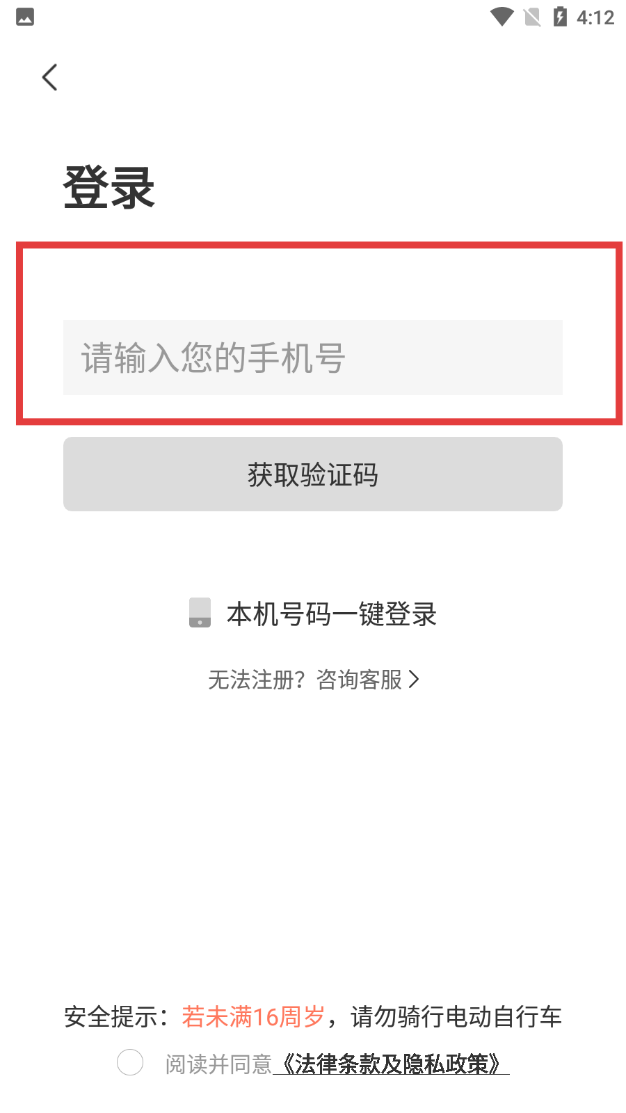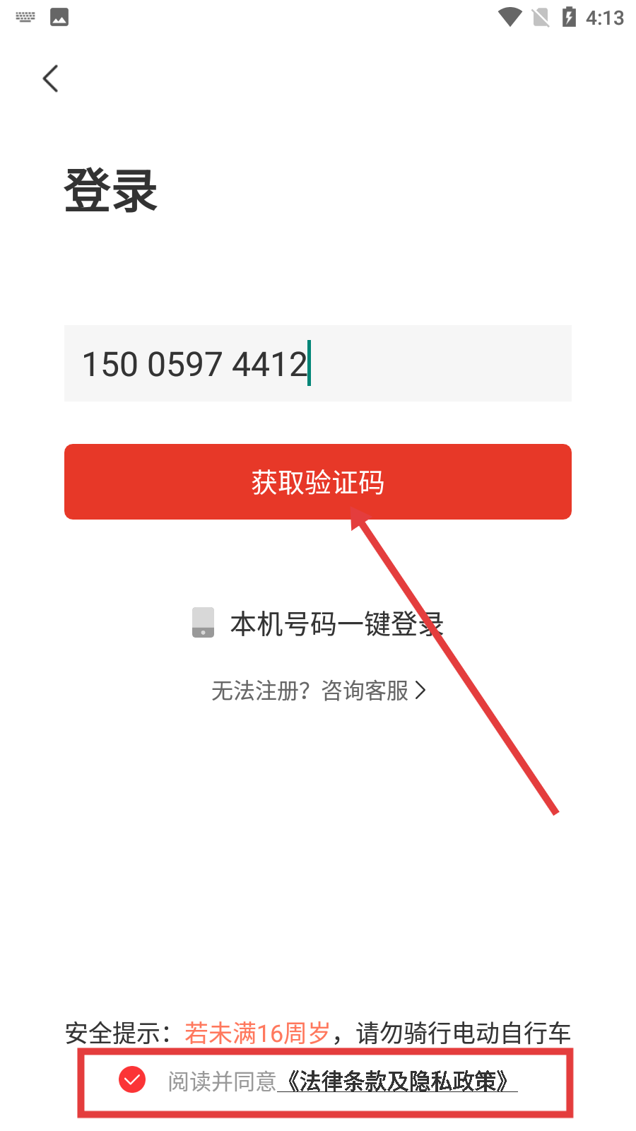 4、輸入手機(jī)號(hào)后,勾選【閱讀并同意《法律條款及隱私政策》】,點(diǎn)擊【獲取驗(yàn)證碼】,完成登錄流程。