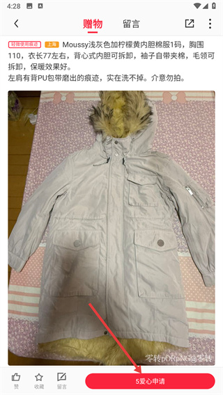 2、在贈物詳情頁面點擊【5愛心申請】,發(fā)起贈物申請操作。