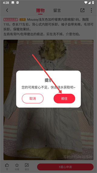 3、若愛心不足,在提示彈窗中點擊【前往】,進(jìn)入愛心獲取頁面。