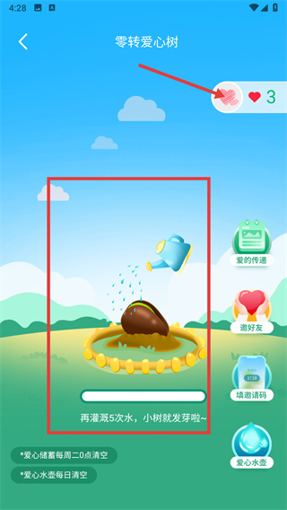 4、在零轉(zhuǎn)愛心樹頁面,通過澆水等操作獲取愛心,為贈物申請做準(zhǔn)備。