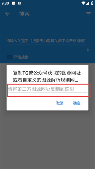 2、在彈出的輸入框中,復(fù)制從TG或公眾號獲取的第三方圖源網(wǎng)址到指定輸入?yún)^(qū)域。