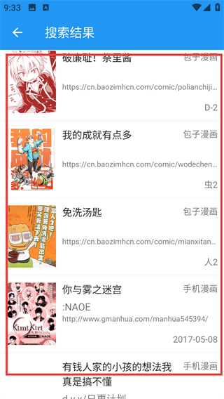4、添加圖源后,在搜索結(jié)果頁面可查看各類漫畫列表,點(diǎn)擊即可瀏覽漫畫內(nèi)容。