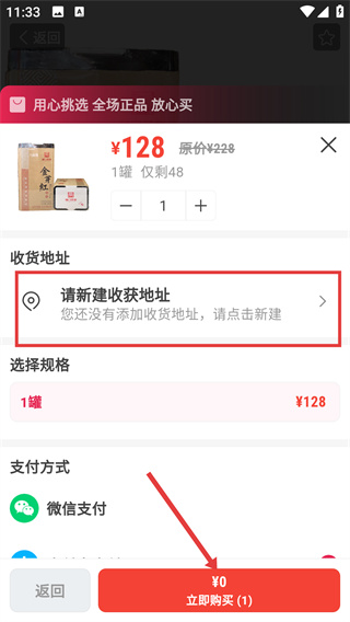 4、在購買確認(rèn)頁面新建收貨地址后,點(diǎn)擊【立即購買】,完成茶葉購買操作。