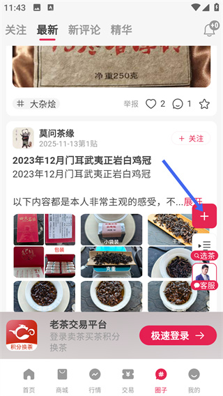 2、在茶友圈頁面點(diǎn)擊“+”號,打開發(fā)布內(nèi)容選擇菜單。