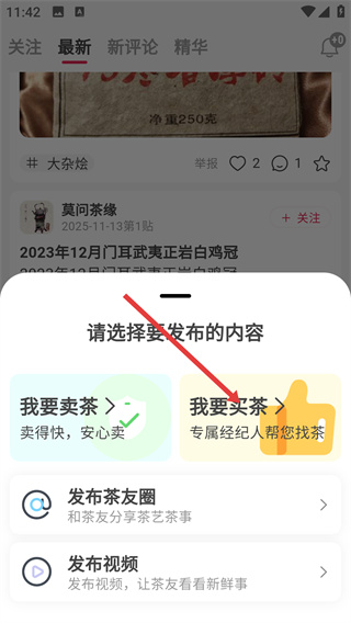 3、在發(fā)布內(nèi)容選擇菜單中點(diǎn)擊【我要買茶】,進(jìn)入買茶信息填寫頁面。