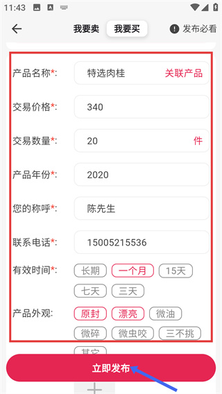4、在買茶信息填寫頁面,填寫產(chǎn)品名稱、交易價(jià)格、產(chǎn)品年份等信息后,點(diǎn)擊【立即發(fā)布】,完成買茶需求發(fā)布操作。
