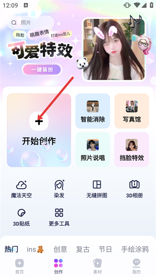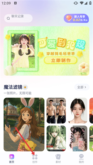 1、打開APP首頁,點(diǎn)擊底部【創(chuàng)作】,進(jìn)入創(chuàng)作頁面,可看到【開始創(chuàng)作】等功能選項(xiàng)。