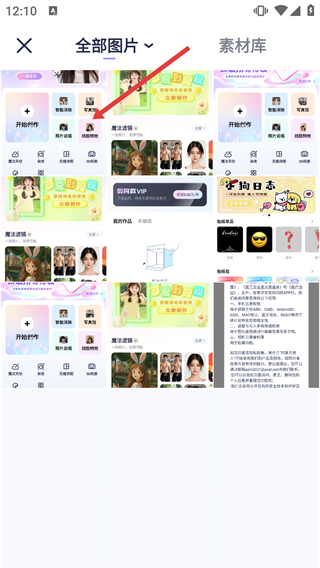 2、在創(chuàng)作頁面,點(diǎn)擊【開始創(chuàng)作】,進(jìn)入【全部圖片】選擇界面,可挑選需編輯的圖片。