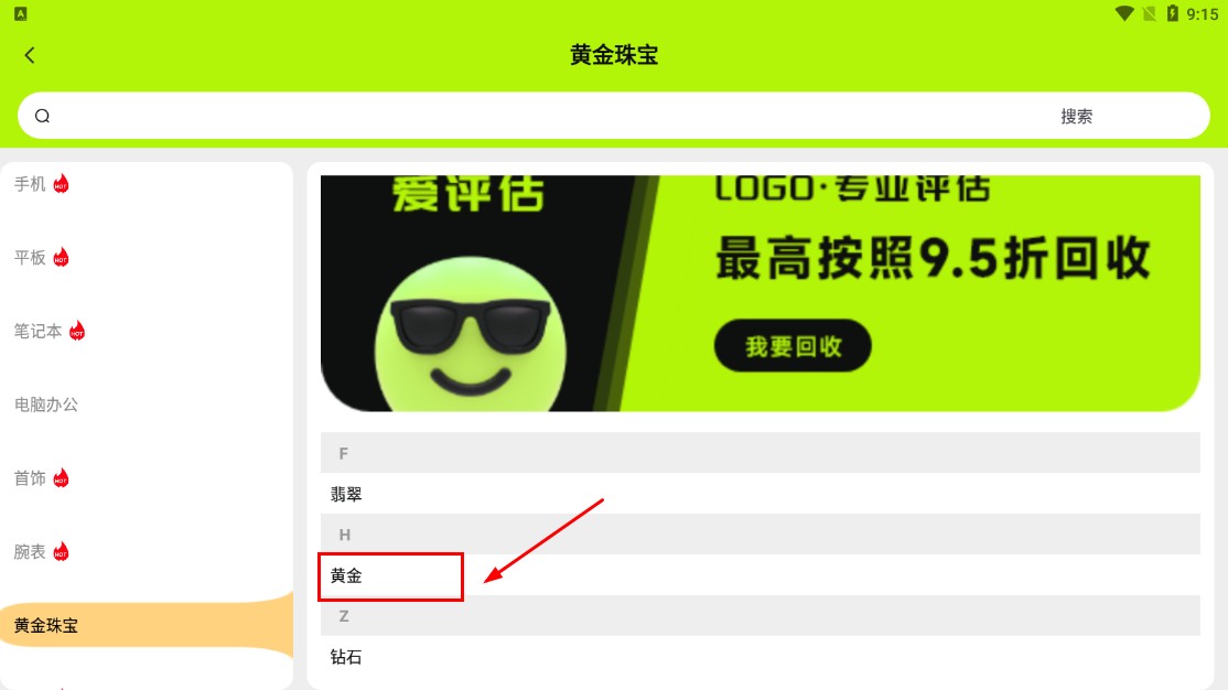 1、在愛評估首頁,點擊【黃金珠寶】圖標,進入黃金珠寶類物品評估回收頁面。
