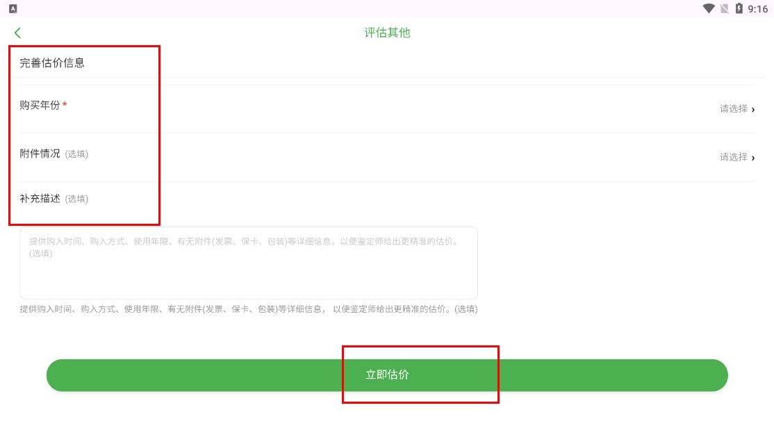 4、填寫【購買年份】【附件情況】【補充描述】后,點擊【立即估價】獲精準估價。