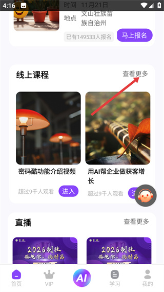 1、在首頁(yè)“線上課程”板塊點(diǎn)擊【查看更多】,進(jìn)入課程列表頁(yè)面。