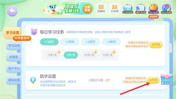 3、驗(yàn)證通過后進(jìn)入【學(xué)習(xí)設(shè)置頁面】,找到跳字設(shè)置欄,點(diǎn)擊【去開通】按鈕,跳轉(zhuǎn)至【會(huì)員選擇界面】。