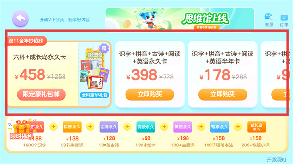 4、在【會(huì)員選擇界面】可挑選【六科+成長島永久卡】等套餐,點(diǎn)擊【立即購買】開通后即可完成跳字設(shè)置操作。