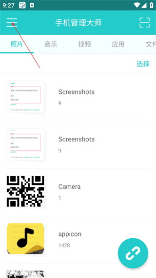 1、打開【手機管理大師】,默認進入【照片】分類頁面,可查看【Screenshots】【Camera】等文件夾及照片數(shù)量。