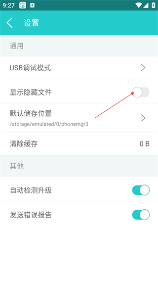 4、開啟【顯示隱藏文件】后,可在設(shè)置頁面查看【USB調(diào)試模式】【默認儲存位置】【清除緩存】等通用設(shè)置項。