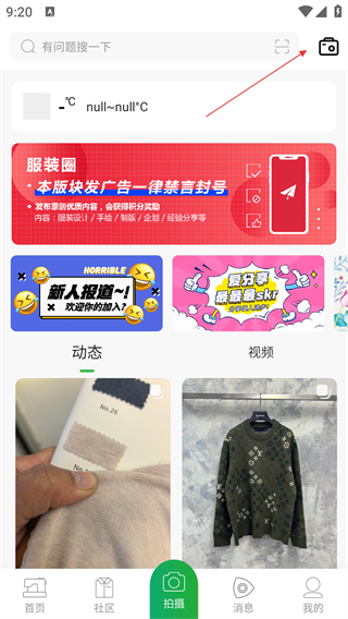 2、點擊頁面右上角的相機圖標(biāo),觸發(fā)內(nèi)容發(fā)布的前置操作入口。