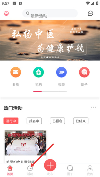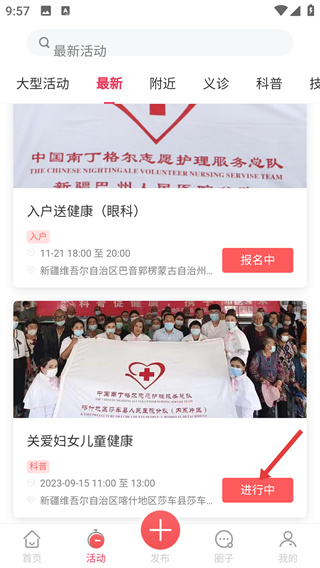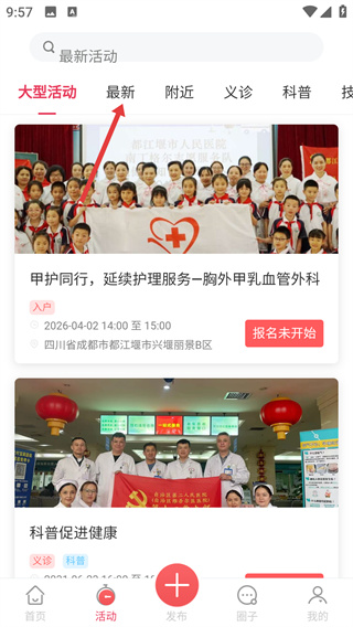 2、在【活動頁面】找到【最新】標(biāo)簽并點擊,切換至【最新活動列表】,能瀏覽【最新發(fā)布-醫(yī)療健康活動】。