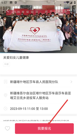 4、在【活動詳情頁】點擊【我要報名】按鈕,按照頁面提示完成操作,即可完成【醫(yī)療健康活動-報名流程】。