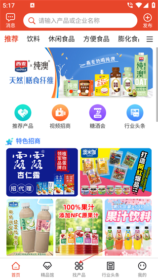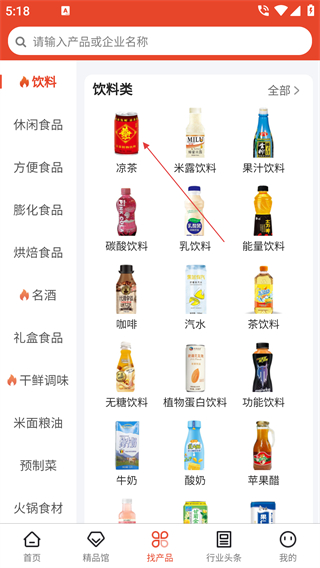 1、點擊底部的【找產(chǎn)品】選項,進(jìn)入產(chǎn)品查找板塊,可瀏覽各類食品飲料類商品。