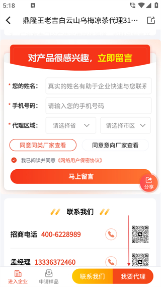4、點擊【我要代理】后,填寫姓名、手機(jī)號等信息,勾選協(xié)議后點【馬上留言】完成代理申請。