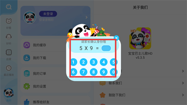 3、點擊【我的設(shè)置】后,彈出身份驗證彈窗,計算【5×9】的結(jié)果,通過數(shù)字鍵盤輸入答案完成驗證,方可進(jìn)入設(shè)置界面。