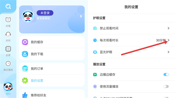 2、貼心設(shè)置護(hù)眼提示與觀看時長管控功能,家長通過專屬設(shè)置即可合理規(guī)劃使用時間,全方位呵護(hù)寶寶視力健康。