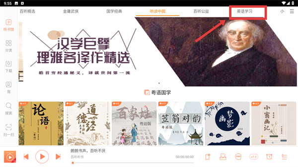 1、在百聽聽書HD版主界面,選擇頂部的【英語(yǔ)學(xué)習(xí)】分類,可瀏覽對(duì)應(yīng)優(yōu)質(zhì)有聲書資源,滿足英語(yǔ)聽書需求。