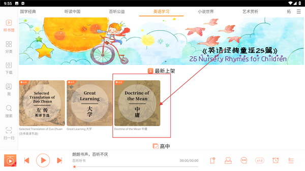 2、進(jìn)入英語(yǔ)學(xué)習(xí)分類頁(yè)面后,找到標(biāo)有最新上架的【DoctrineoftheMean-中庸】,點(diǎn)擊查看書籍詳情。