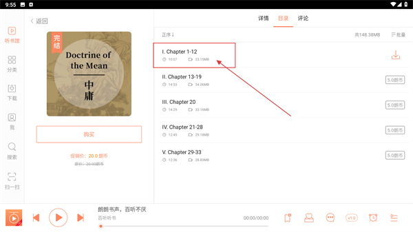 3、在書籍詳情的目錄頁(yè),選擇【I.Chapter1-12】章節(jié),可查看其時(shí)長(zhǎng)和大小,準(zhǔn)備進(jìn)行收聽。