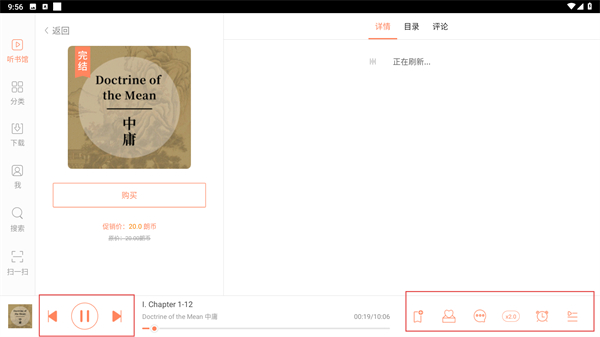 4、點(diǎn)擊章節(jié)后進(jìn)入播放界面,可使用底部的【播放控制-倍速調(diào)節(jié)-定時(shí)關(guān)閉】功能,優(yōu)化聽書體驗(yàn)。