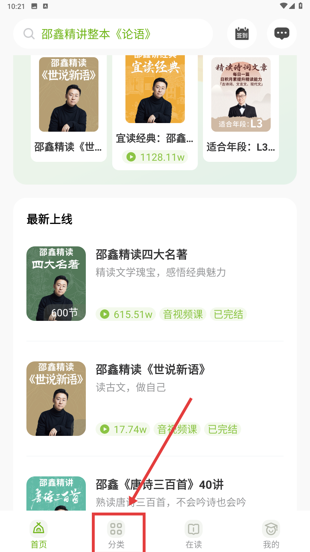 1、在首頁點擊【分類】按鈕進入分類頁面,可瀏覽邵鑫精讀的各類經(jīng)典內(nèi)容課程,找到感興趣的學(xué)習(xí)資源。