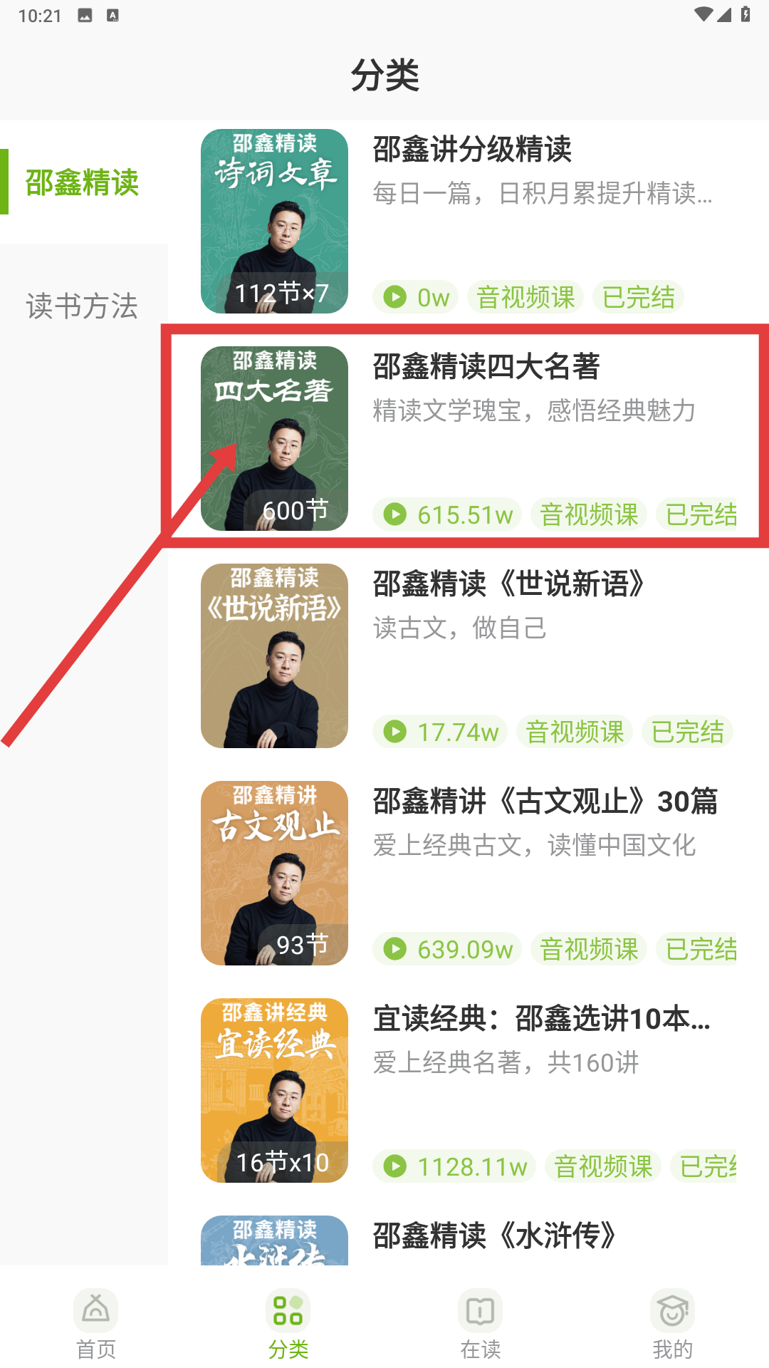 2、在分類頁面找到【邵鑫精讀四大名著】課程,點擊進入詳情頁,能查看課程簡介與章節(jié)結(jié)構(gòu),了解學(xué)習(xí)內(nèi)容。
