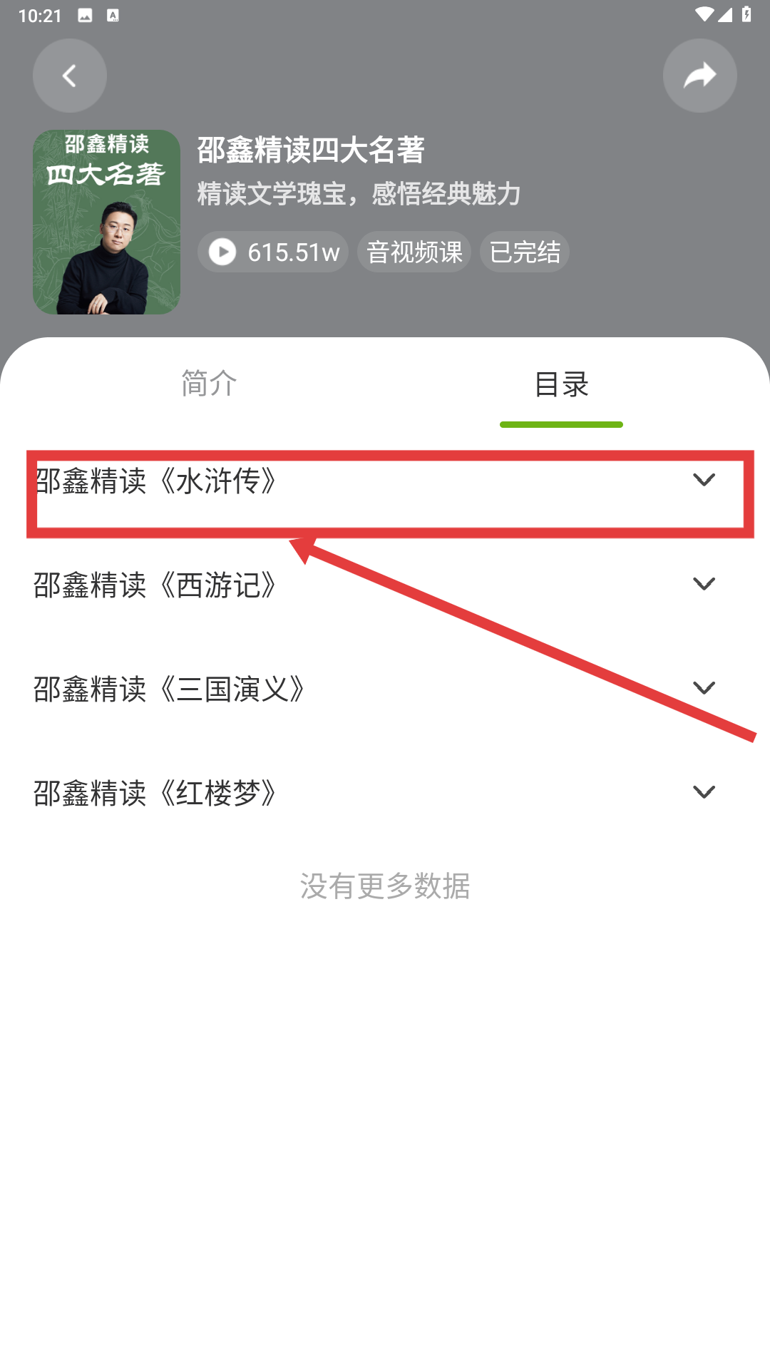 3、在課程詳情頁打開【目錄】,點擊【邵鑫精讀《水滸傳》】下拉菜單,展開選擇具體章節(jié)開始學(xué)習(xí)。