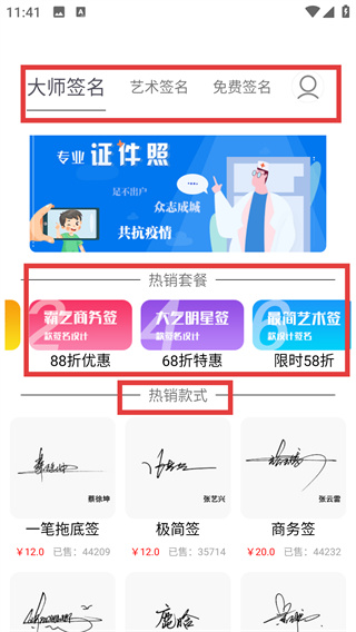 1、在簽名設(shè)計APP中,可選擇【大師簽名】【藝術(shù)簽名】【免費簽名】分類,瀏覽【熱銷套餐】和【熱銷款式】,了解各類簽名設(shè)計選項。
