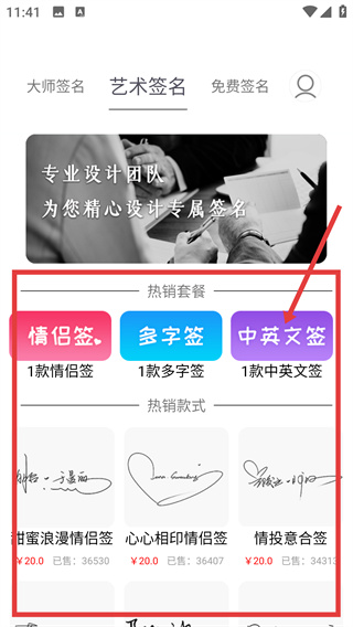 2、切換至【藝術(shù)簽名】標(biāo)簽,可選【情侶簽】【多字簽】【中英文簽】等套餐,挑選心儀的藝術(shù)簽名風(fēng)格。