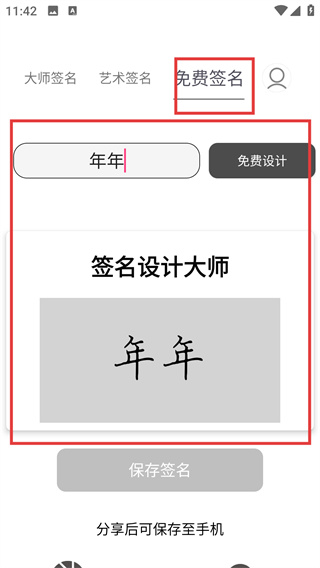 4、切換到【免費簽名】標(biāo)簽,在輸入框輸入名字,點擊【免費設(shè)計】生成簽名,分享后可保存至手機(jī)。