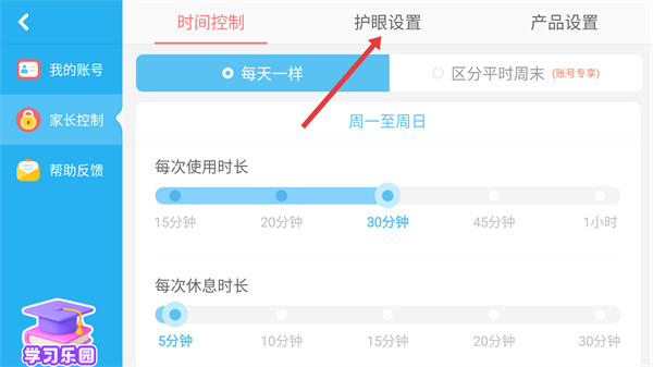 3、在家長控制界面點(diǎn)擊【護(hù)眼設(shè)置】標(biāo)簽,切換至護(hù)眼設(shè)置頁面。