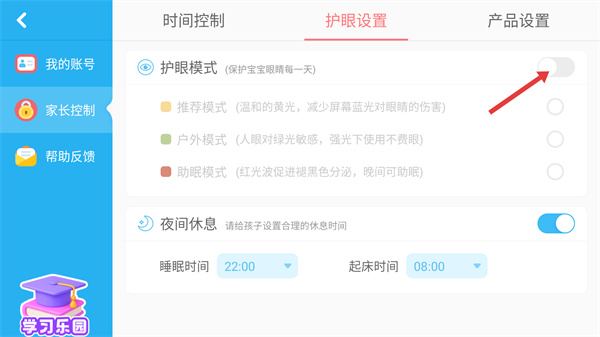 4、在護(hù)眼設(shè)置頁面開啟【護(hù)眼模式】,可選擇【推薦模式】【戶外模式】【助眠模式】,保護(hù)寶寶眼睛。