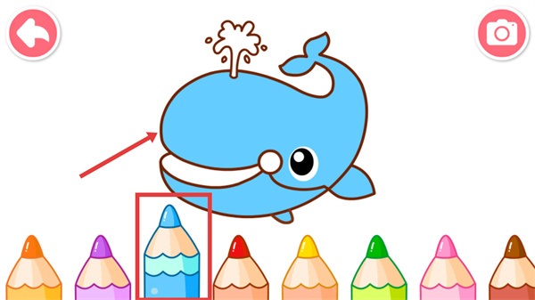 4、在創(chuàng)作頁面,選擇【藍色蠟筆】,點擊鯨魚身體部位為它填充顏色,完成后可保存或分享涂色作品。