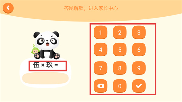 2、在答題解鎖頁面,計算“伍X玖”得45,通過數(shù)字鍵盤輸入45,完成家長中心解鎖。